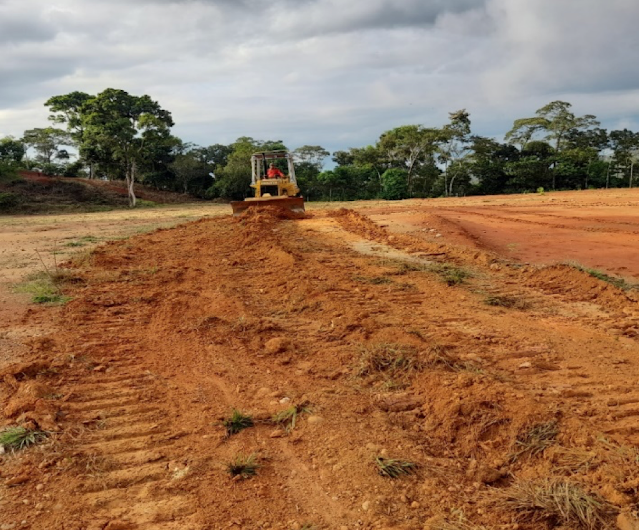 Clichés ci-dessus et ci-dessous : En mars 2022, avec le début de la saison sèche, il est possible de débuter le nivellement du futur terrain de football avec un engin de chantier.